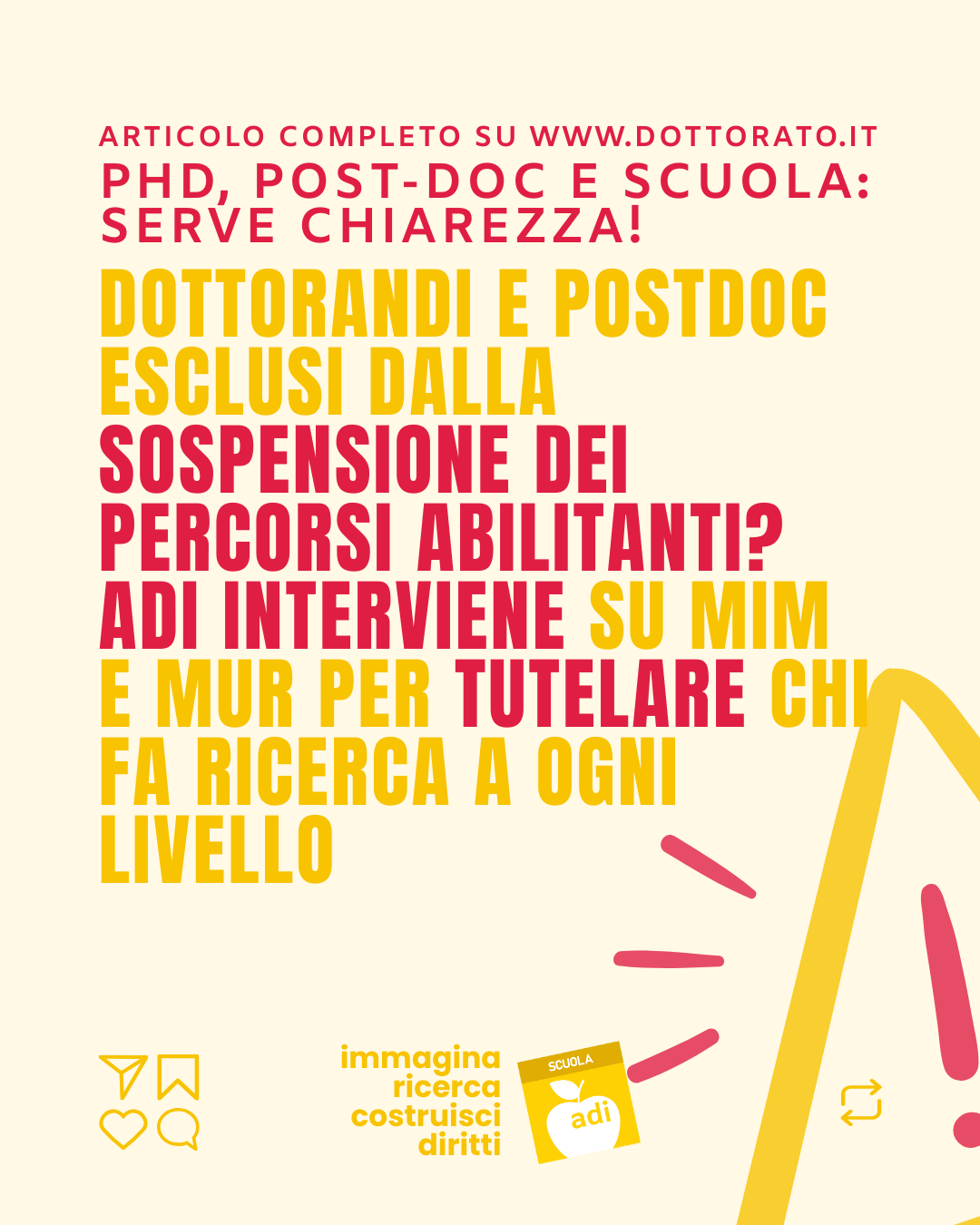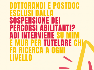A seguito di numerose richieste giunte allo sportello nazionale, l’Associazione Dottorandi e Dottori di Ricerca in Italia (ADI) ha segnalato con due esposti agli uffici del Minisitero dell’Istruzione e del Merito, l’uno del 10 luglio e l’altro del 3 settembre, una situazione fortemente penalizzante che coinvolge numerosi PhD e postdoc attualmente iscritti ai percorsi di formazione iniziale abilitanti all’insegnamento e risultati vincitori del primo concorso docenti bandito nell’ambito del PNRR (cd. “PNRR1”). In molti, anche in ragione di periodi di mobilità internazionale o di impegni legati alla ricerca scientifica, si sono trovati nella necessità di posticipare la frequenza del percorso abilitante, senza per questo rinunciare alla propria posizione a tempo indeterminato ottenuta tramite concorso. Tale possibilità, spesso ostacolata dagli Atenei e dagli Uffici Scolstici Regionali, è prevista dall’art. 4, comma 6, del D.M. 156/2025, secondo cui, in in linea di continuità con quanto previsto nei precedenti percorsi abilitanti (es. TFA):