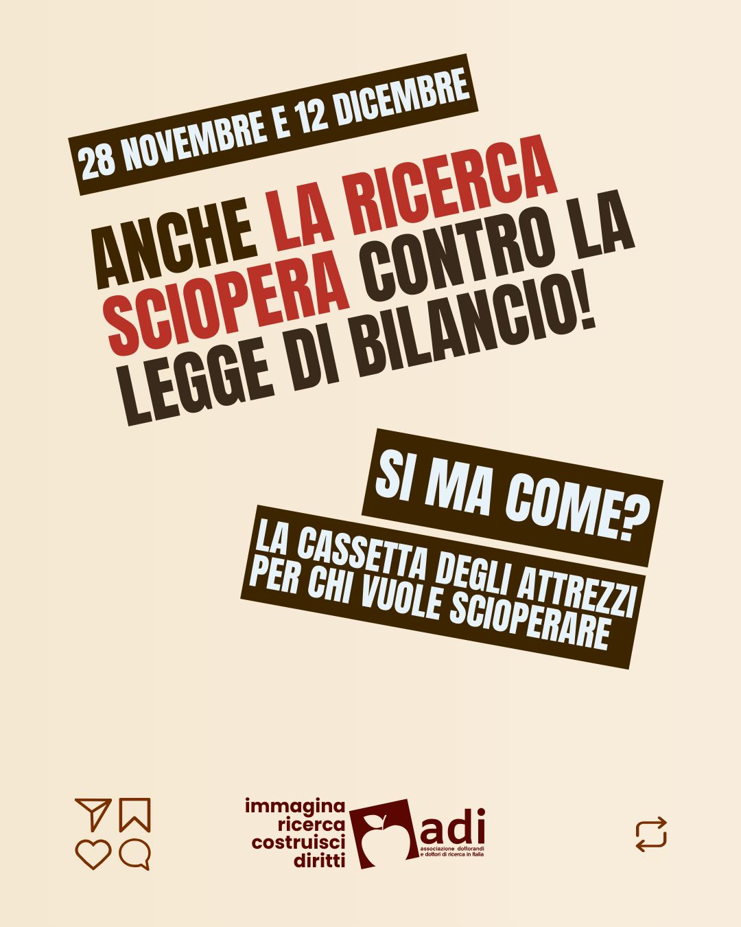Rights are won by exercising them: even the right to strike is built through striking. For this reason, as ADI, we invite everyone to join the days of protest alongside workers throughout Italy and to reaffirm, together, that research too will come to a halt. To make the participation of our category a reality, we offer our toolbox, made up of collective practices and actions that allow us to truly experience these days of strike action.